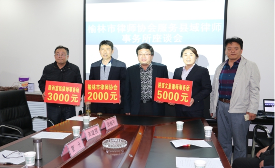 会议最后还举行了“结对帮扶”仪式。榆林市律师协会、陕西文星律师事务所、陕西富能律师事务所分别向陕西信一律师事务所捐赠了2000元、5000元、5000元现金,用于该所添置办公桌椅及设备资金,帮助其进一步改善办公环境,提高工作效率。